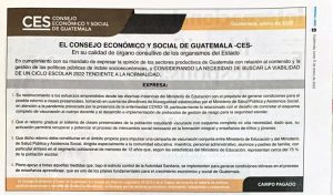 Pronunciamiento del CES ante el inicio del ciclo escolar 2022, en el cual recomienda que el retorno gradual a clases presenciales sea propicio para impulsar una campaña de vacunación conjunta entre el Ministerio de Educación y el Ministerio de Salud Pública y Asistencia Social, dirigida especialmente a la comunidad educativa con énfasis en el segmento poblacional de menores de 12 años.